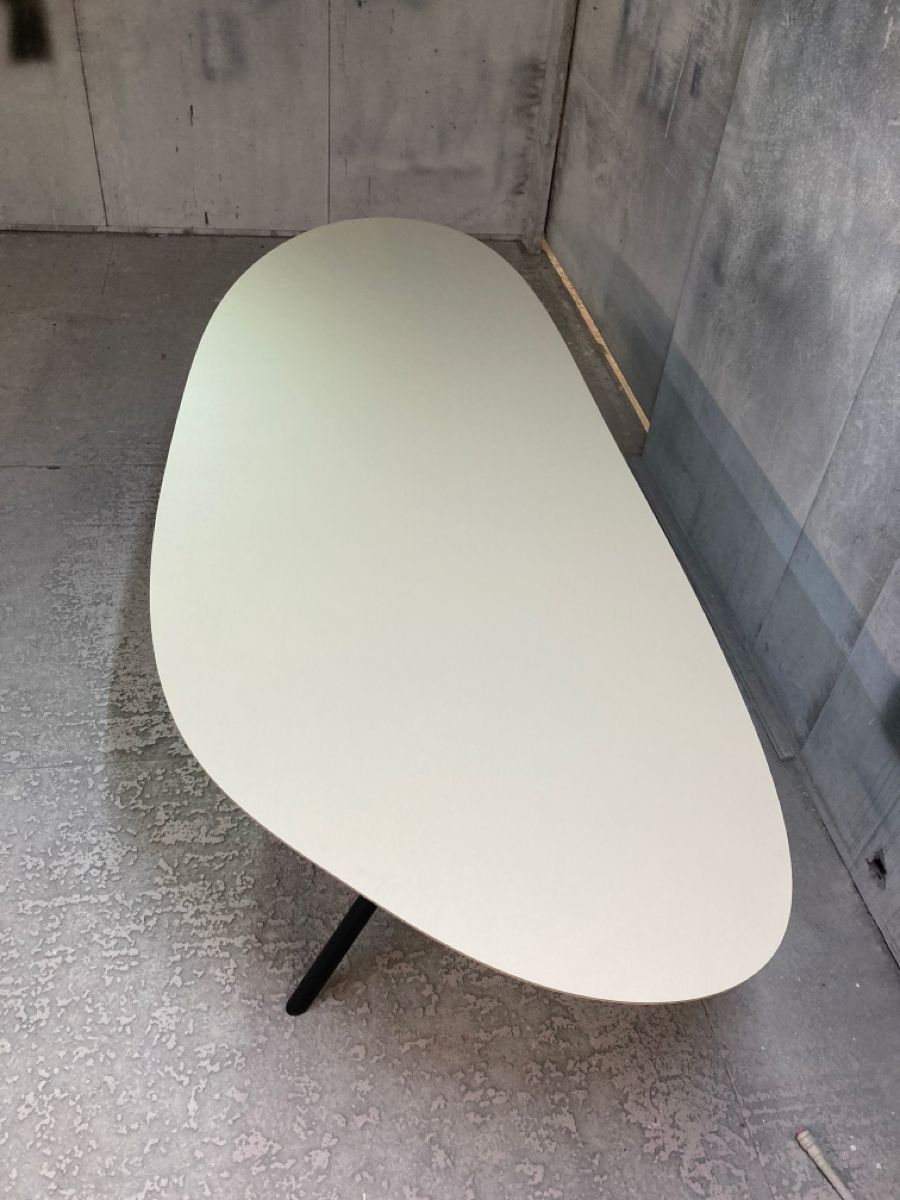 Mesas e tampos com formatos orgânicos e bordas arredondadas;